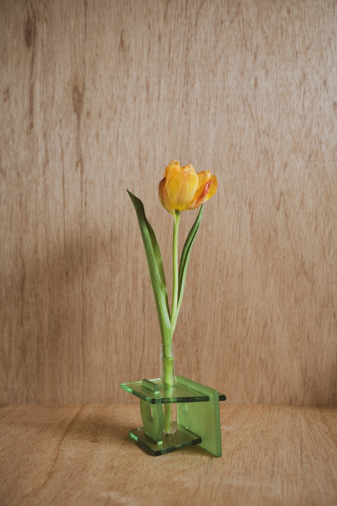 小さなケーキのような一輪挿し。 4枚のパネルを組み合わせて、立てても倒しても使えます。 質感の異なる2種のアクリルを同色で染色しています。 【素材】アクリル(試験管のみガラス) 【サイズ】w100mm x h70mm / 試験管 15Φ x 150mm ※本商品は、ポスト投函にてお届けいたします。